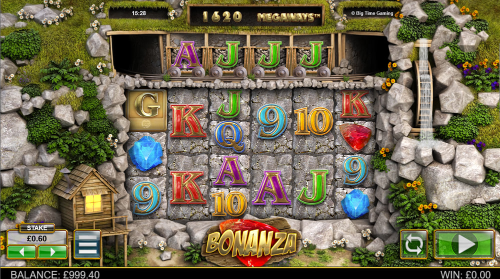 Bonanza’s paytable features vibrant gems as high-paying symbols, with the Purple Gem offering the top rewards. Lower values come from the A-9 card royals. The dynamite Wild symbol aids in forming combinations by substituting for all symbols except the Scatter. To unlock Free Spins, land four G.O.L.D. Scatter symbols anywhere on the reels.