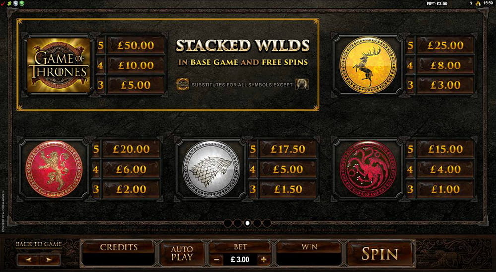 Wahre Fans, die bis jetzt nicht in den Genuß gekommen sind mit 243 Ways zu gewinnen, sollten sich nicht ärgern. Es gibt noch andere Game of Thrones Slotautomaten. Wie wir vorher schon erwähnten, kam der Game of Thrones 243 Ways zusammen mit seinem Zwilling Game of Thrones 15 Lines auf den Markt. Die zwei Spiele könnte man fast als Spiegelung voneinander beschreiben. In der Tat sind die einzigen Unterschiede die Anzahl der Gewinnlinien und die Menge der Gewinne. Game of Thrones 15 Lines hat, wie ihr euch wahrscheinlich vorstellen könnt, 15 Gewinnlinien. Außerdem hat er eine leicht höhere RTP als sein Zwilling – 96,37%. Weiterhin ist dieses Spiel mit einer mittleren bis hohe Varianz ausgestattet, was bedeutet, dass man zwar seltener auf einer Gewinnlinie landet aber wenn, dann sollte der Gewinn eher groß sein. Daher ist das Spiel vor allem für High- Roller mit einem größeren Budget geeignet, die es sich leisten können eine längere Zeit zu spielen in der sie auf ihren großen Gewinn warten.