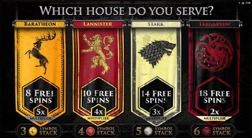 Das “Free Spins Bonus Feature” des Spiels wird ausgelöst, wenn der Spieler auf mindestens drei der eiserner Thron “Scatter Symbolen” landet. Passiert dies, leitet das Spiel euch in eine spezielle Bonusrunde, in der ihr euch für eins der vier Häuser von Westeros und Essos entscheiden müsst. Nehmt ihr Baratheon, belohnt euch das Spiel mit 8 “Free Spins” und eure Gewinne werden verfünffacht. Ihr erhaltet außerdem eine besondere Belohnung, wenn ihr auf drei gestapelten Haus Baratheon-Siegelsymbolen landet. Als andere Option bietet euch das Haus Lannister 10 “Free Spins”, vervierfachten Gewinn und vier gestapelte Symbole des Hauses Lannister lösen die besondere Prämie aus. Nehmt ihr jedoch das Haus Stark erhaltet ihr 14 “Free Spins” und der Gewinn wird verdreifacht. Die besondere Belohnung gibt es bei 5 gestapelten Symbolen des Hauses Stark. Entscheidet ihr euch für das letzte Haus – das Haus Targaryen – bekommt ihr 18 “Free Spins” mit einem verdoppelten Gewinn. Die besondere Belohnung gibt es hier für 6 gestapelte Symbole des Hauses. Behaltet im Hinterkopf, dass die “Free Spins” auch hier wieder ausgelöst werden können, sobald ihr in einer Runde auf drei “Scatter Symbolen” landet. Welches Haus ihr wählt, ist euch natürlich frei überlassen, unserer Erfahrung nach ist jedoch das Haus Baratheon jenes mit dem höchsten Gewinn.