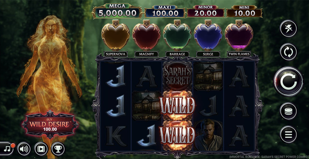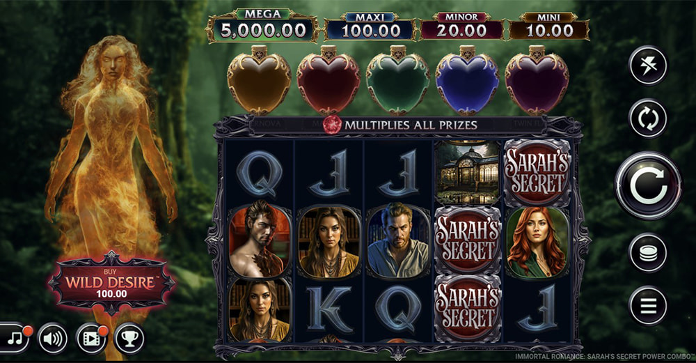 Immortal Romance: Sarah’s Secret Power Combo offers a direct route to its potent Wild Desire feature through a bonus buy option. The cost for this option is 100x your current bet. This purchase grants guaranteed, instant entry into the Wild Desire feature, where up to 5 reels can become fully Wild for a single spin, significantly enhancing potential for large combinations.