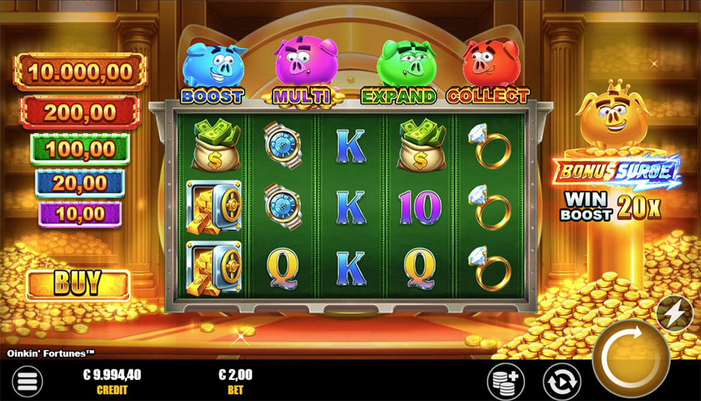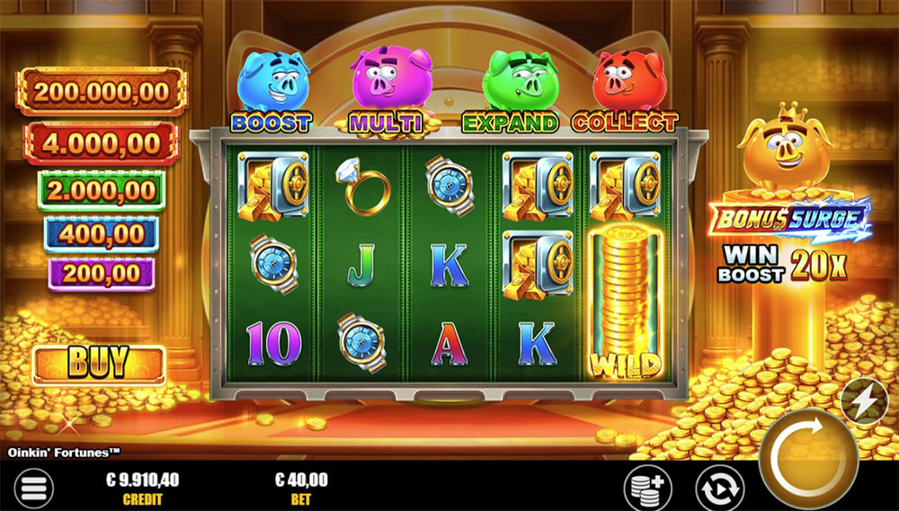 - Bonus Surge™: This supercharged bonus round is triggered by landing two or more different-colored Scatters. Bonus Surge™ ramps up Link&Win™ with multipliers up to 200x, unlocks additional Oinkin’ Upgrades, provides a final spin boost, and enables access to the in-built jackpots.