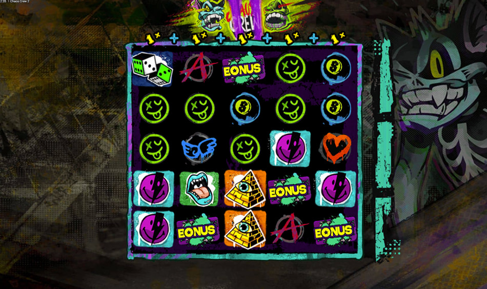 The Chaos Crew 2 paytable includes lower-value and premium symbols. The Cranky Cat stands as the highest-paying regular symbol, awarding x20 for five of a kind. Wilds, also represented by the Cranky Cat, substitute for others and carry multiplier values. The Bonus! Scatters trigger the game’s bonus features.
