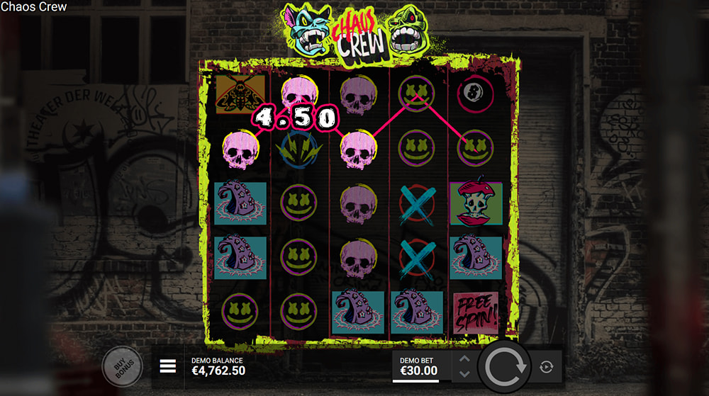 Chaos Crew offers a direct path to its most engaging mechanics through a bonus buy option. It allows players to bypass base game play and immediately access the free spins mode. This feature is not available for players in the UK.