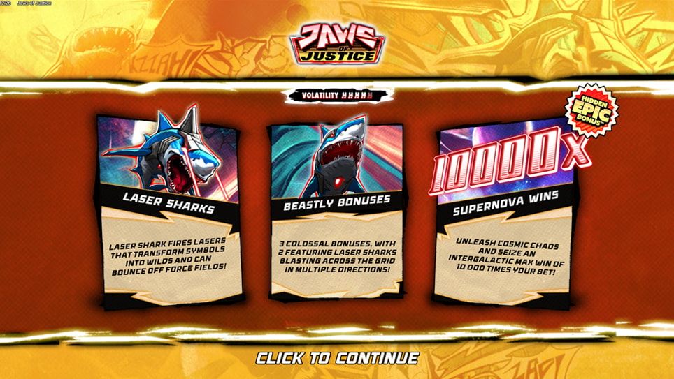 The key features in Jaws of Justice revolve around its Laser Shark symbols and multi-level Free Spins rounds, which includes Killer Cosmos, Chompocalypse, and Nuclear Nebula. They make the slot so much more fun.