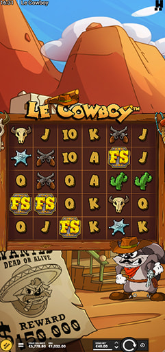 Le Cowboy employs Cluster Pays, where winning combinations are formed by groups of matching symbols. Low-paying symbols include card ranks (10-A), while high-paying symbols are thematic icons like the Sheriff Badge and Skull. The Wild symbol aids in forming clusters by substituting for others. Crucially, landing FS Scatter symbols is the key to triggering the game’s most dynamic and action-packed bonus features.