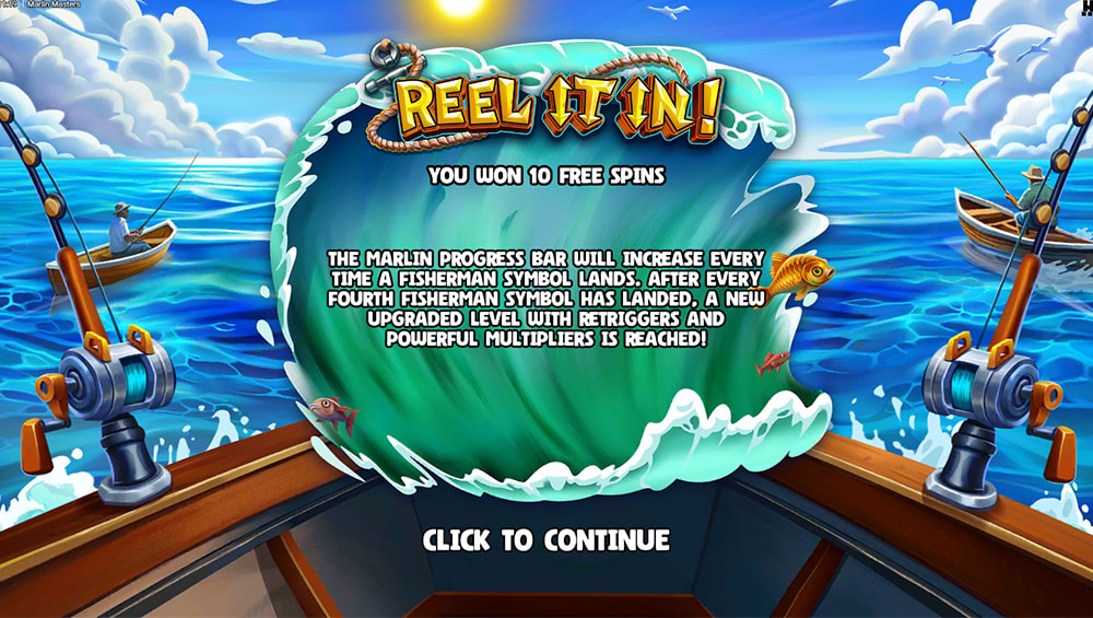 - REEL IT IN! BONUS FEATURE: Activated by landing 3 FS symbols, this feature awards 10 free spins. A Marlin Progress Bar advances with each Fisherman symbol, granting additional spins and increasing guaranteed Fisherman multipliers (up to x10).
