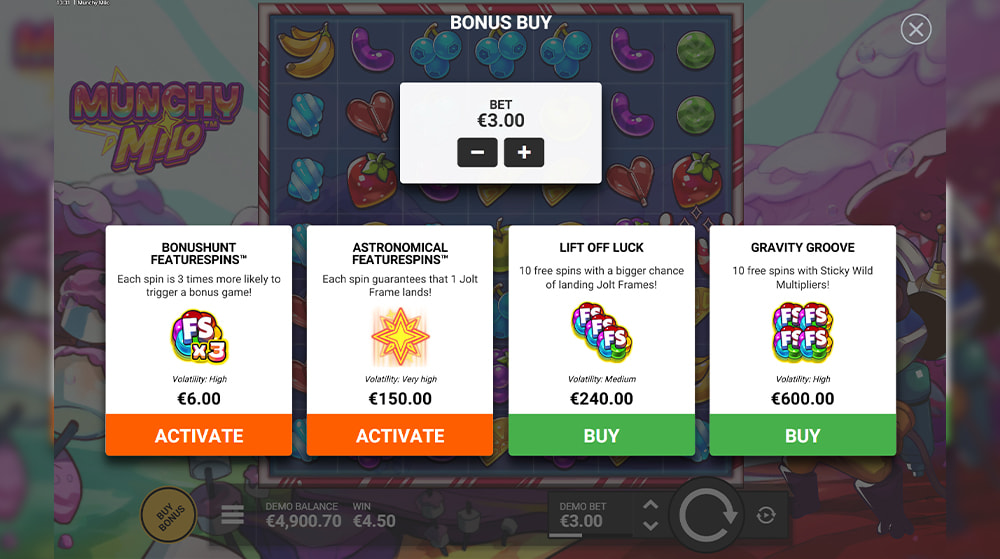 Yes, Munchy Milo offers several bonus buy options for immediate feature access. Players can opt for selections like BonusHunt FeatureSpins for 3x the bet, or directly purchase bonus rounds. Before taking advantage of any of these features, make sure you won't go over your predetermined gambling budget.