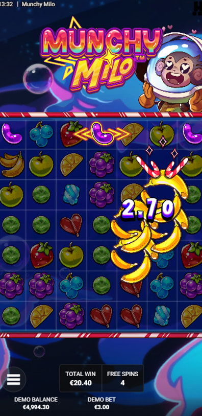 Munchy Milo’s entertainment comes from Jolt Frames, which spread to transform symbols into winning clusters, and Chain Reaction, which can extend these transformations across the grid. These mechanics, combined with multi-level bonus games, ensure a highly engaging and unpredictable session.
