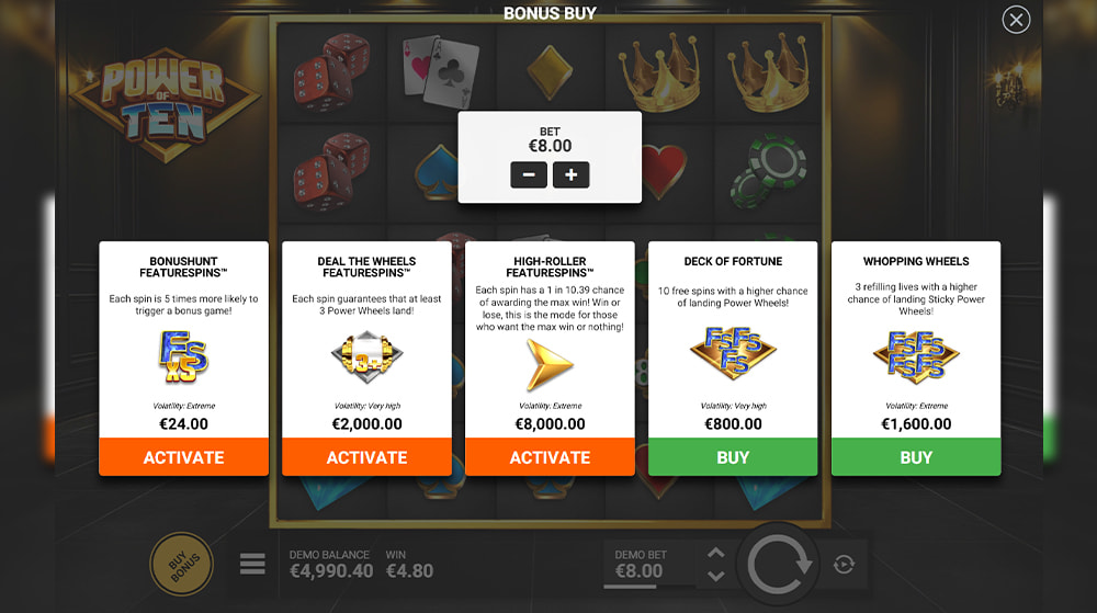 Yes, Power of Ten features several bonus buy options. Players can purchase direct access to features like BONUSHUNT FEATURESPINS™, DEAL THE WHEELS FEATURESPINS™, and more. Each of these options has a specific cost, RTP, and volatility level. Always claim such features cautiously.