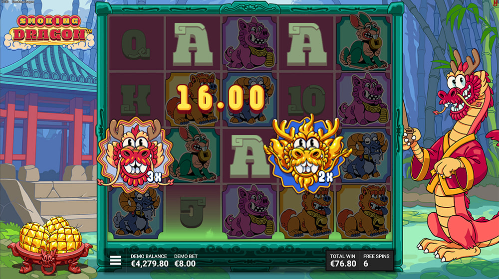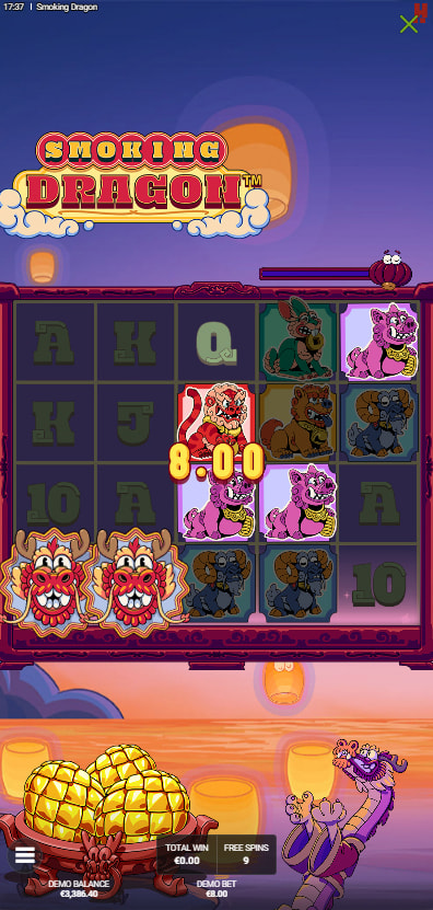 Smoking Dragon’s paytable features high-value Red and Golden Dragon Heads, alongside themed animal symbols for mid-tier wins, and traditional card ranks as lower payers. Wins are formed if matching symbols appear on adjacent reels.
