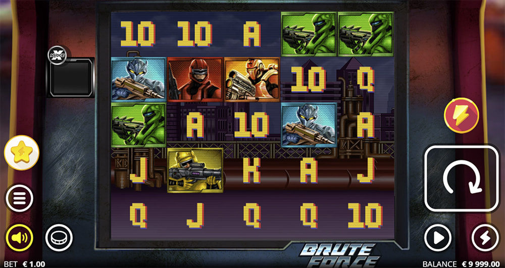 Brute Force’s paytable features low-paying card royals and higher-value armored fighters, with the Orange/Red Armored Fighter paying x20 for five symbols. Wild symbols, specifically the xNudge Wilds, land stacked and nudge into full view, increasing their win multiplier with each nudge. The Scatter symbol is crucial for unlocking the game’s high-potential bonus features.