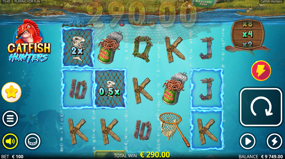 Catfish Hunters's gameplay revolve around Electrical Frames and Impostor Wilds. The slot includes the popular xWays mechanics and three free spins games, including Dark Water Spins, Deep Water Spins, and Overcharged Spins. For payers outside the UK, there's an extensive bonus buy menu.