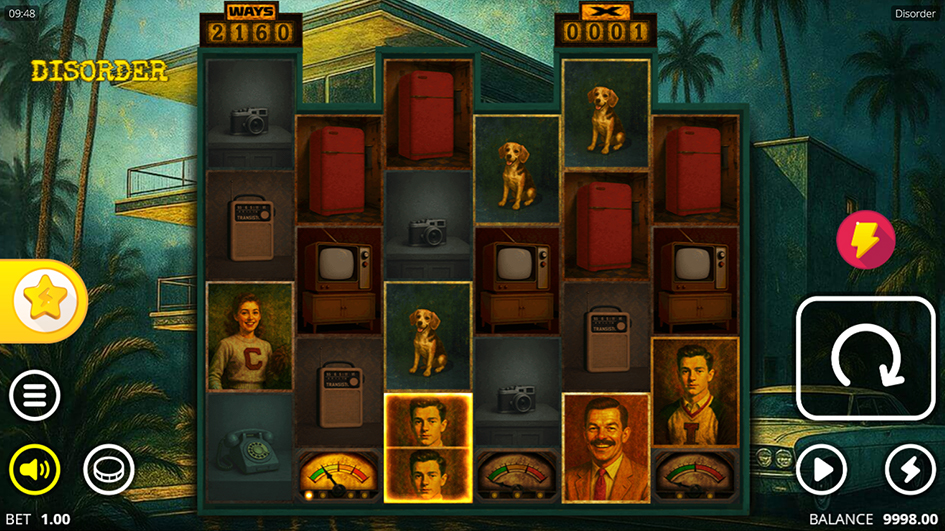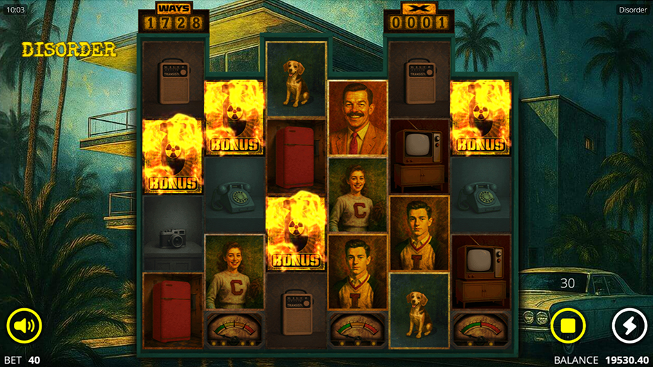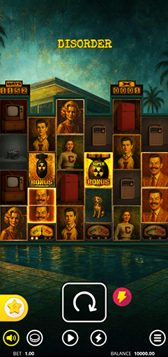 Disorder’s paytable is split between lower-value appliance symbols and higher-paying family members, with the Father symbol offering the highest regular payout at 6x for six. Wilds, such as the Nuclear Wild and xBomb, enhance winning potential by transforming symbols or increasing multipliers. Crucially, the Bonus symbol serves as the gateway to the game’s high-potential bonus rounds, providing the primary path to significant returns.