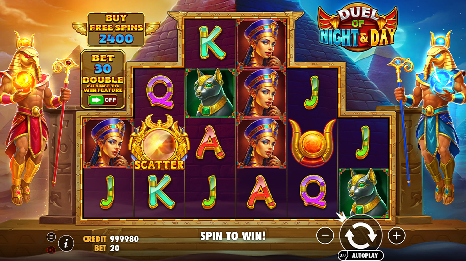 The paytable of Duel of Night & Day features both lower and higher value symbols. The Sun and Moon symbols are the most valuable regular symbols, offering the highest payouts for six-of-a-kind. Standard Wild symbols assist in forming winning combinations by substituting for other paying symbols. However, the Scatter symbol is pivotal, serving as the sole trigger for the game’s high-potential bonus features, which are central to unlocking the biggest wins.