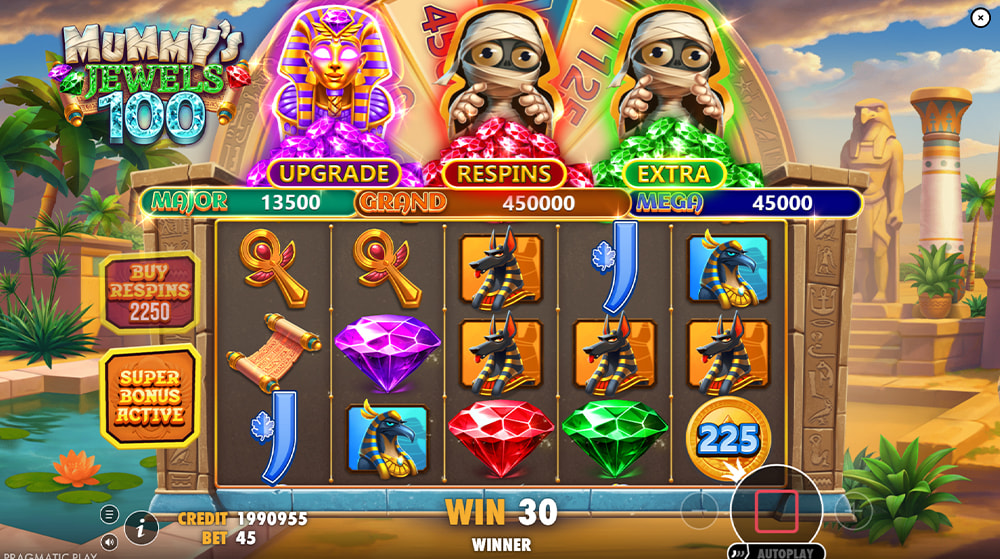 Mummy’s Jewels 100 delivers action through its innovative feature set. This includes the Eye of Ra collect symbols gathering adjacent money values, and distinct colored wilds activating unique bonuses. These wilds trigger an Upgrade feature, an Extra feature, or a Respins round, often combining to boost gameplay and potential payouts.