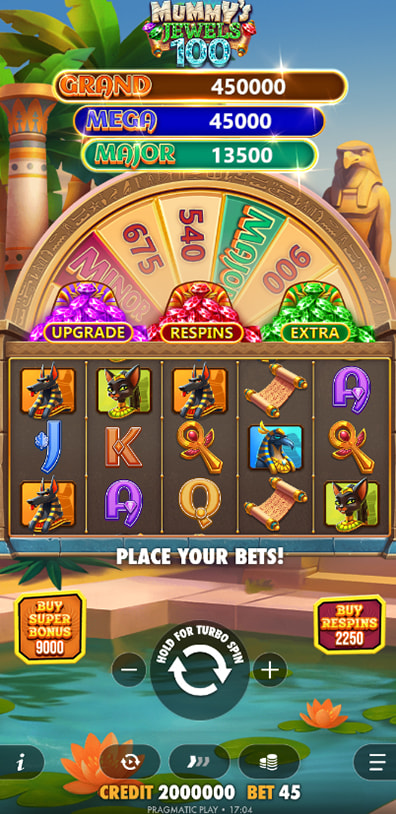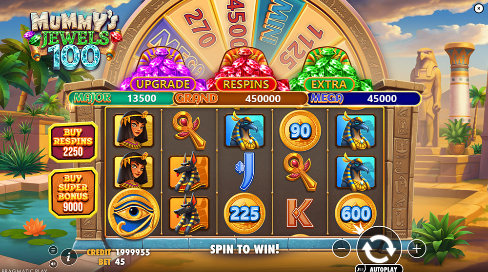 Key features in Mummy's Jewels 100 revolve around the Eye of Ra collects and the multi-colored wilds. These elements trigger mechanics like an Upgrade feature, Extra pointers, and Wild Respins. You can also buy some of the game's features via two bonus buy options - Buy Respins and Buy Super Bonus.