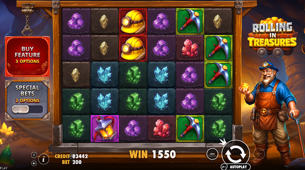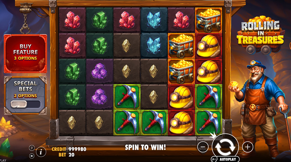 - Free Spins: Triggered by landing 4, 5, or 6 miner bonus symbols, awarding 10, 15, or 20 initial free spins respectively. The multiplier, starting at 2x, increases by +1 after each tumble and crucially, does not reset during the entire round. Five additional free spins can be retriggered.