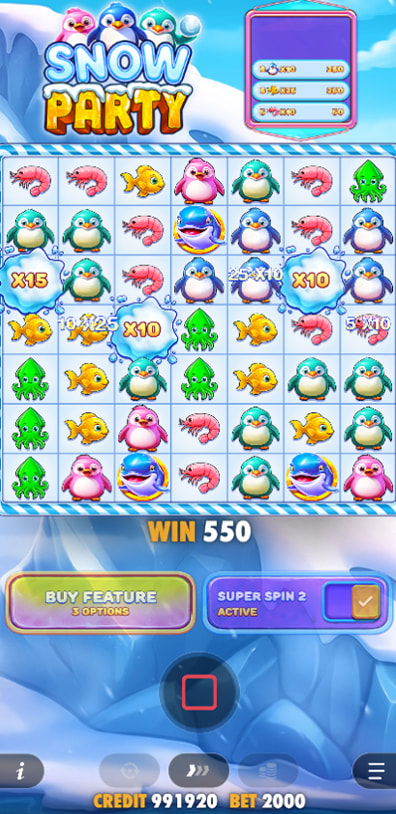 Yes, Snow Party offers multiple bonus buy options. Players can directly access the Free Spins feature for 100x their total bet or the Super Free Spins for 500x. There's another, third option - for 200x the total bet, you can trigger the Free Spins feature with a random number of Scatters.