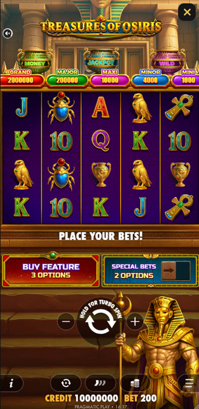 Yes, Treasures of Osiris includes a bonus buy menu. You can purchase different versions of the free spins bonus round. Additionally, there are two special bets - an ante bet giving you a higher chance to trigger the special feature and Super Spin, where Money and wild symbols are active, and frames are guaranteed.