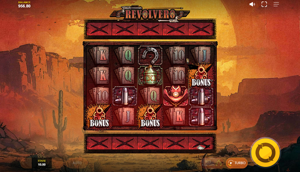 Revolvero’s paytable features lower-paying card ranks (10-A) and higher-value thematic symbols, with the Bull Skull and Gold Bars offering the top regular payouts at x15 for five of a kind.