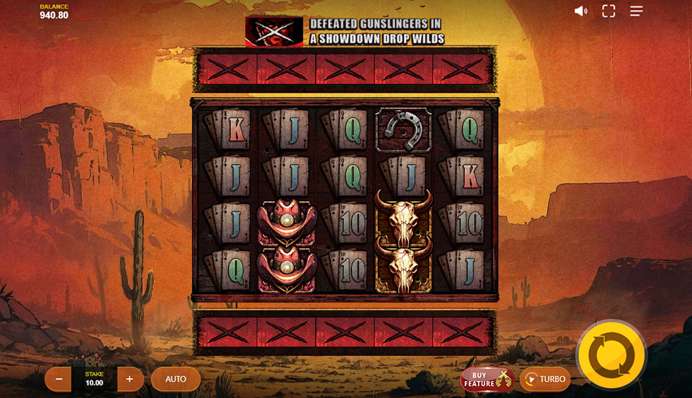 - Showdown: Triggered when two Gunslinger symbols land directly above and below the same reel. The Gunslinger that is ‘shot’ will drop a random number of Wilds onto the reels. If Wilds land on existing Wilds, their multipliers double, applying to all involved winning lines.