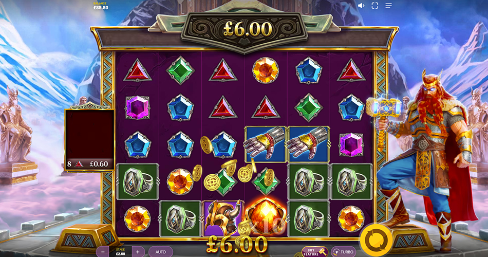 Thor’s Rage features a 6×5 grid where wins are formed by landing 8 or more matching symbols anywhere on the screen. The game includes standard paying symbols alongside special symbols that unlock its core mechanics. These include the Wild, which substitutes for regular symbols to help form winning combinations, and the Scatter symbol, which is key to triggering the main bonus round. Multiplier symbols also appear to enhance payouts.